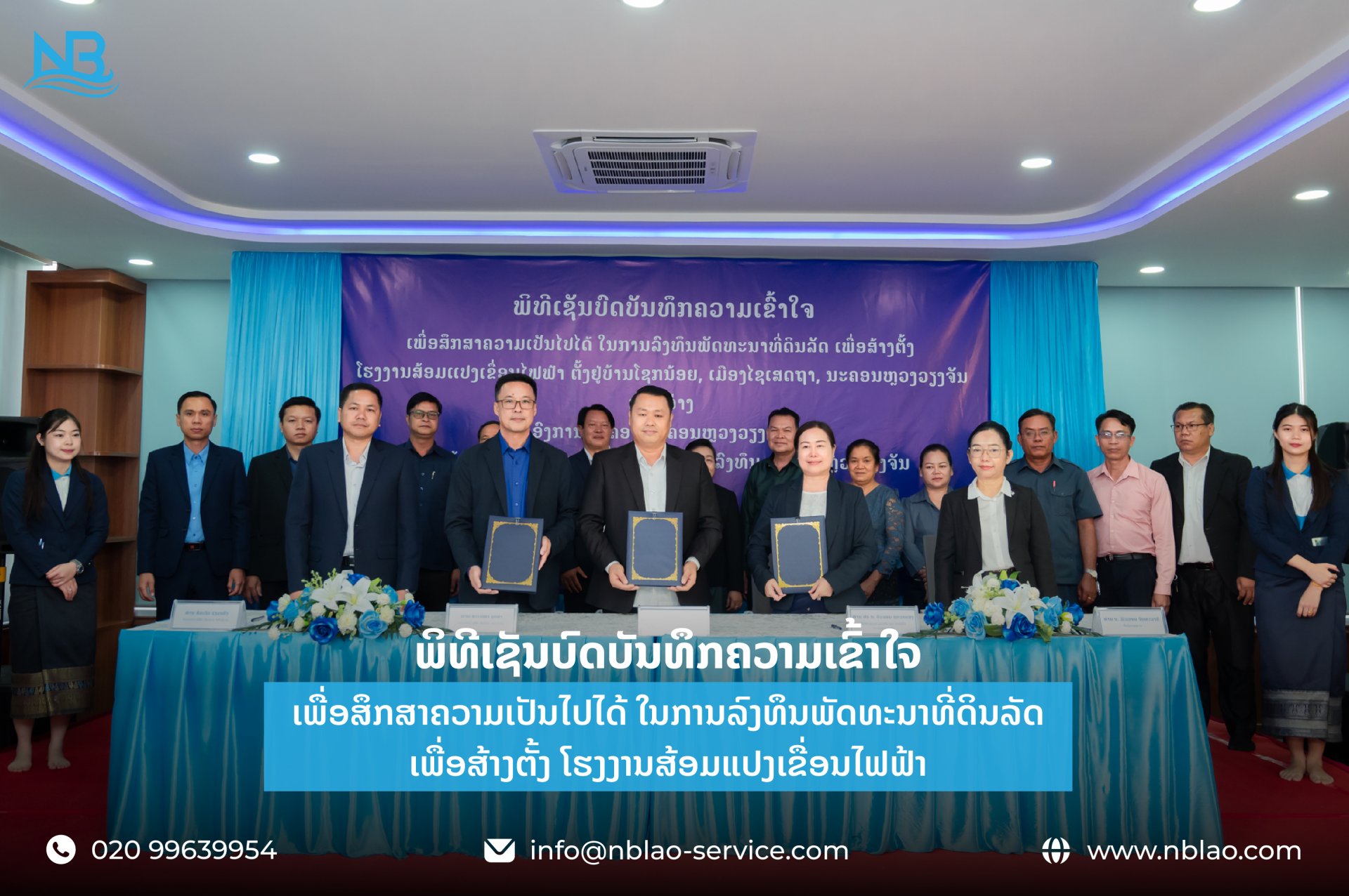 ພິທີເຊັນບົດບັນທຶກຄວາມເຂົ້າໃຈ (MOU) ວ່າດ້ວຍການສຶກສາຄວາມເປັນໄປໄດ້ໃນການລົງທຶນພັດທະນາທີ່ດິນລັດ ເພື່ອກໍ່ສ້າງໂຮງງານສ້ອມແປງເຂື່ອນໄຟຟ້າ ຕັ້ງຢູ່ ບ້ານໂຊກນ້ອຍ, ເມືອງໄຊເສດຖາ, ນະຄອນຫຼວງວຽງຈັນ ລະຫວ່າງ ອົງການປົກຄອງນະຄອນຫຼວງວຽງຈັນ ຕາງໜ້າໂດຍ ພະແນກ ແຜນການ ແລະ ການລົງທຶນ ແລະ ບໍລິສັດ ເອັນບີລາວ ຈໍາກັດຜູ້ດຽວ ໃນຄັ້ງວັນທີ 6 ມິຖຸນາ 2025, ທີ່ສໍານັກງານໃຫຍ່ ບໍລິສັດ ເອັນບີລາວ ຈໍາກັດຜູ້ດຽວ ບ້ານ ນາໄຫ ເມືອງຫາດຊາຍຟອງ ນະຄອນຫຼວງວຽງຈັນ.